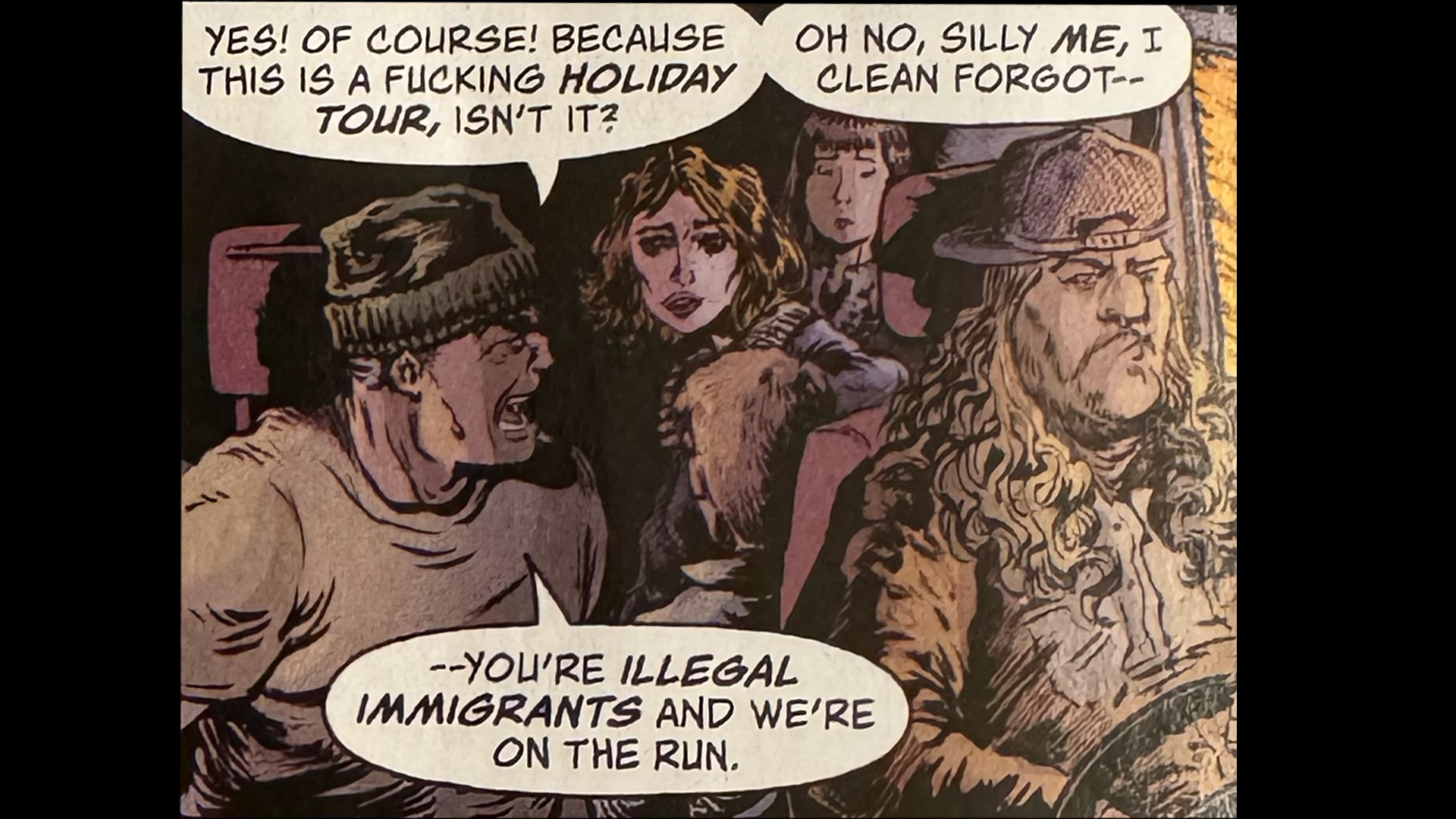 Ces derniers ne semblent avoir aucune empathie et compassion pour les êtres humains qu’ils transportent. On retrouve ici les critiques bien placées de Dan Houser et de ses équipes. Alors que deux migrantes demandent à leurs « chauffeurs » s’il est possible de s’arrêter pour aller aux toilettes, ce dernier répond ironiquement qu’il n’y a aucun souci, étant donné qu’ils sont actuellement en plein road trip touristiques. Avant d’effectuer un retour brutal à la réalité, rappelant aux jeunes femmes qu’elles ne sont que des migrants clandestins et qu’ils sont actuellement, tous en fuites.
